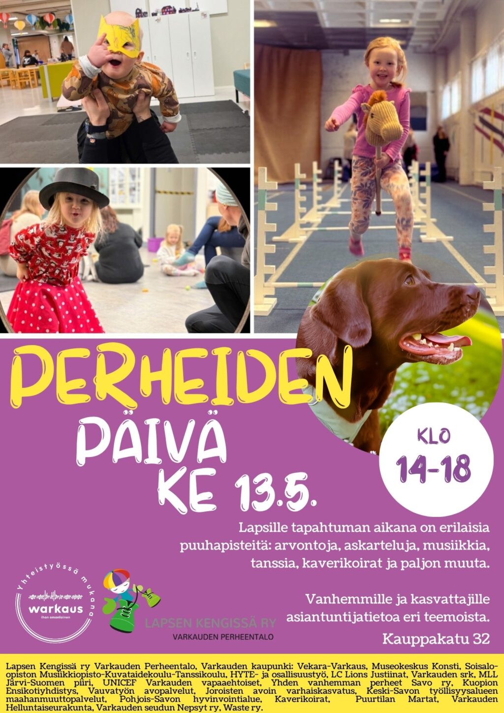 Keskiviikkona 13.5. klo 14–18 Varkauden Perheentalolla ja sen edustalla järjestetään maksuton tapahtuma, joka kokoaa yhteen lähes kaksikymmentä lapsiperhetoimijaa tarjoamaan elämyksiä, kohtaamisia ja hyödyllistä tietoa lapsiperheille.